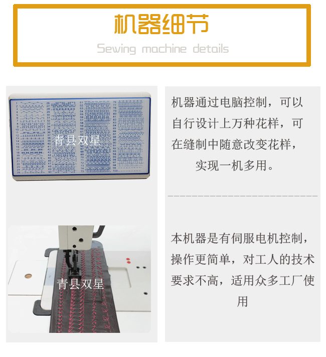 You can change the machine needle’s thickness model to adjust sewing treely according to the thickness of sewing workpiece and threads to make the trading limits more broad.The machine passes a computer control,can design by oneself around ten thousandcultivate flowers kind,can be stitch half-way to at will change pattern,carry out a machine to much use.Applicable for carious factories because this machine has servo motor-controlled with its simple operation and low requirements for workers.