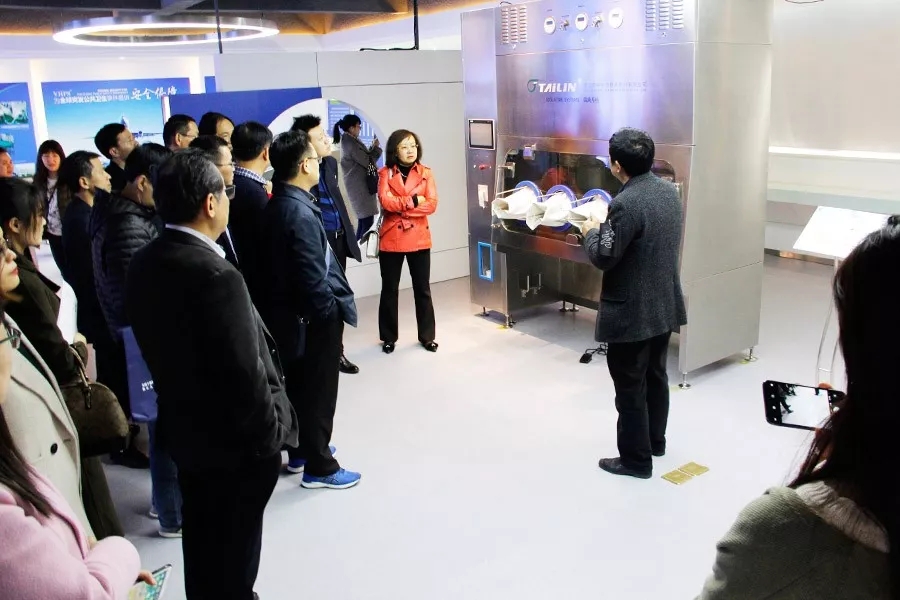 來訪領導專家首先參觀了泰林生物科技展廳,全面地了解了泰林生物的發展現狀,醫藥行業領導對無菌隔離器系統、過氧化氫滅菌器、微生物檢測系統及TOC分析儀等泰林核心產品產生了極大的興趣。參觀的同時也對產品的操作過程及性能特點展開了討論,充分肯定了泰林生物的科研技術及成果。