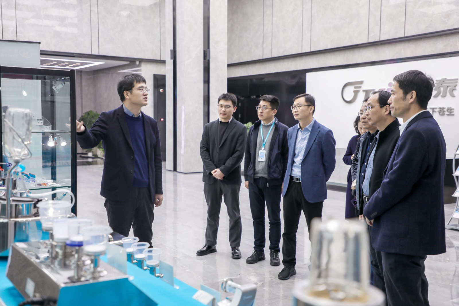 簽約結束后,在泰林生命科學副總經理徐磊的陪同下,南方水中心張東總經理一行參觀了泰林生命科學與泰林醫學工程兩個園區,詳細了解泰林水生態(微生物、寄生蟲和藻類)檢測整體解決方案創新與探索,并就水生態檢測領域的研發與場景化應用進行了深入交流,同時對泰林在制藥、新材料、環保、半導體等領域的應用與布局表示贊賞。